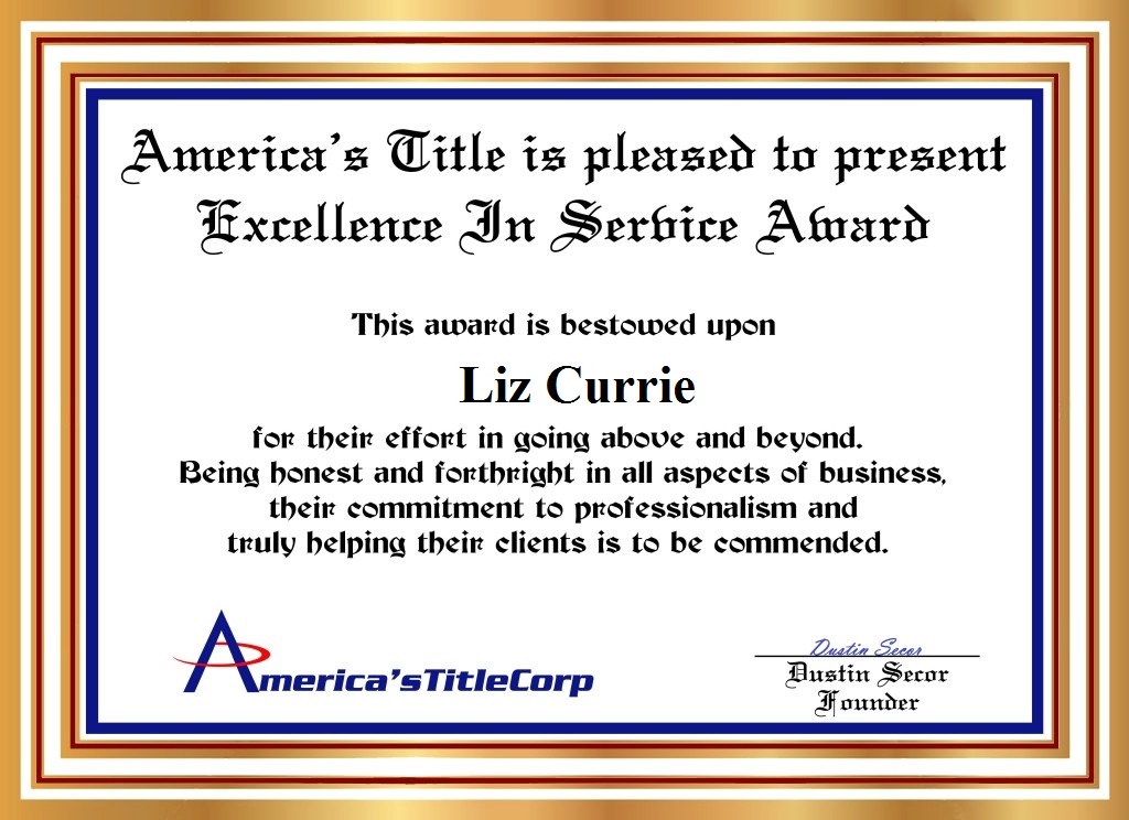 We are pleased to provide the Liz Currie review for you and recognize Liz Currie-Fuller as the recipient of America’s Title’s: