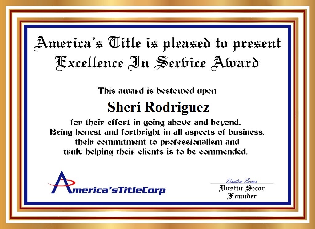 We are pleased to provide the Sheri Rodriguez review for you and recognize Sheri Rodriguez as the recipient of America’s Title’s: